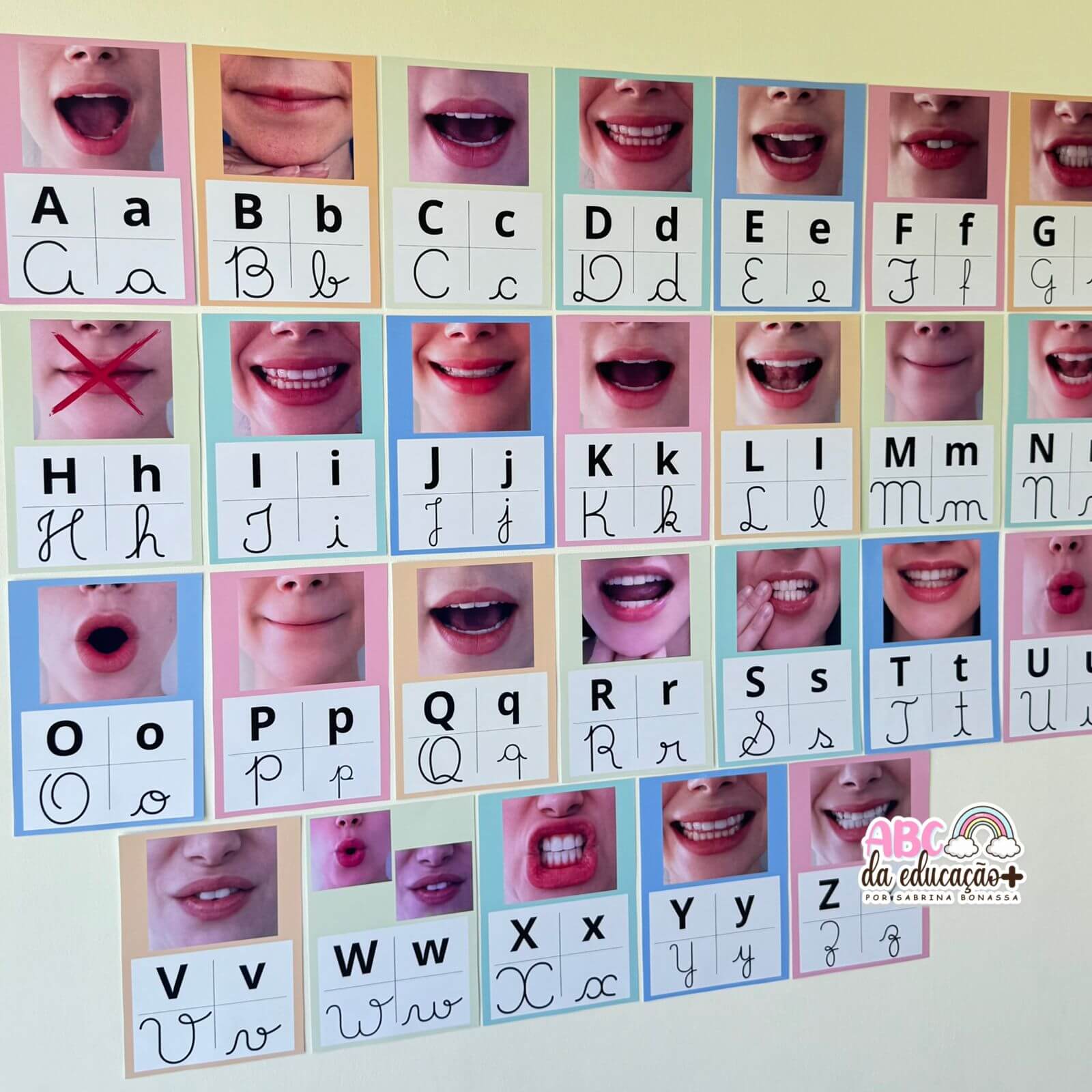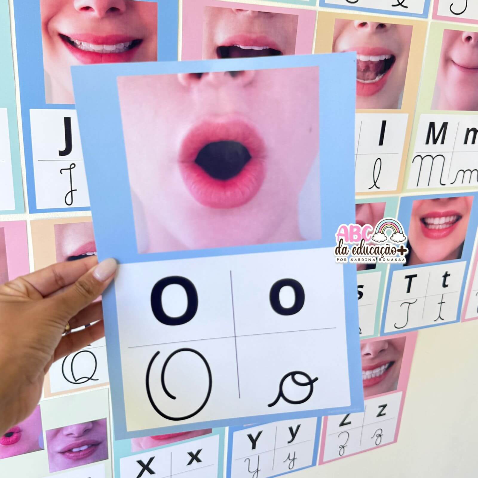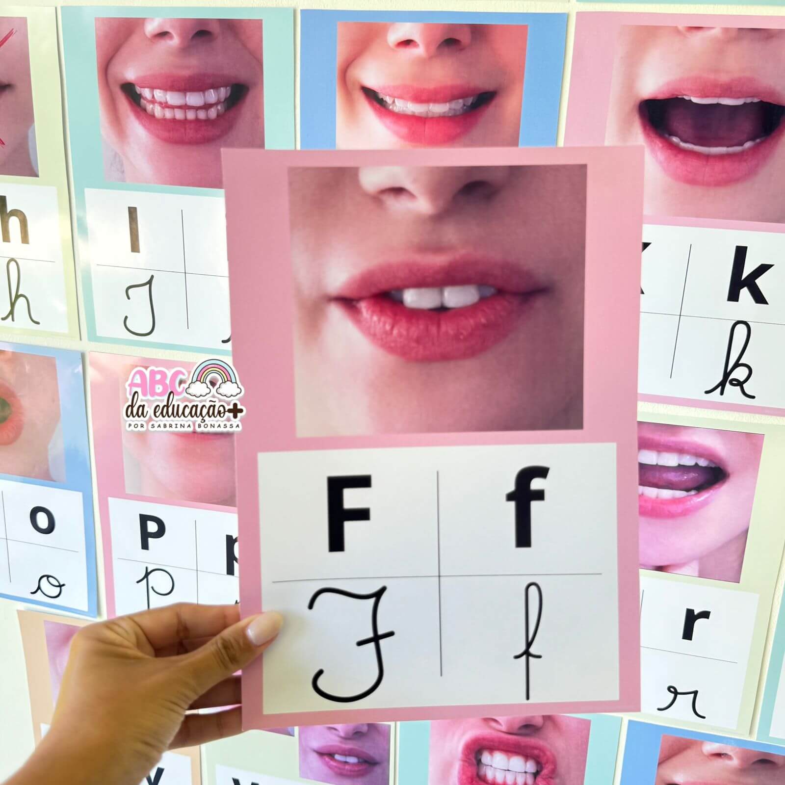 O Alfabeto Fonético Visual é um recurso pedagógico indispensável para o processo de alfabetização. Cada letra do alfabeto (A a Z) é apresentada com imagem real da posição da boca no momento da articulação do som, auxiliando a criança a compreender, visualizar e produzir corretamente os fonemas.