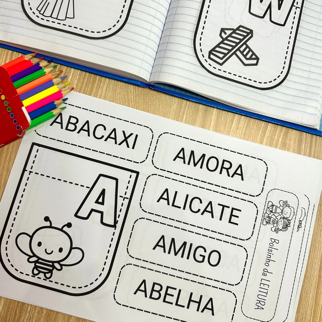 O arquivo Bolsinho da leitura inclui 26 páginas de atividades interativas para trabalhar as letras do alfabeto. Essa proposta oferece a possibilidade de