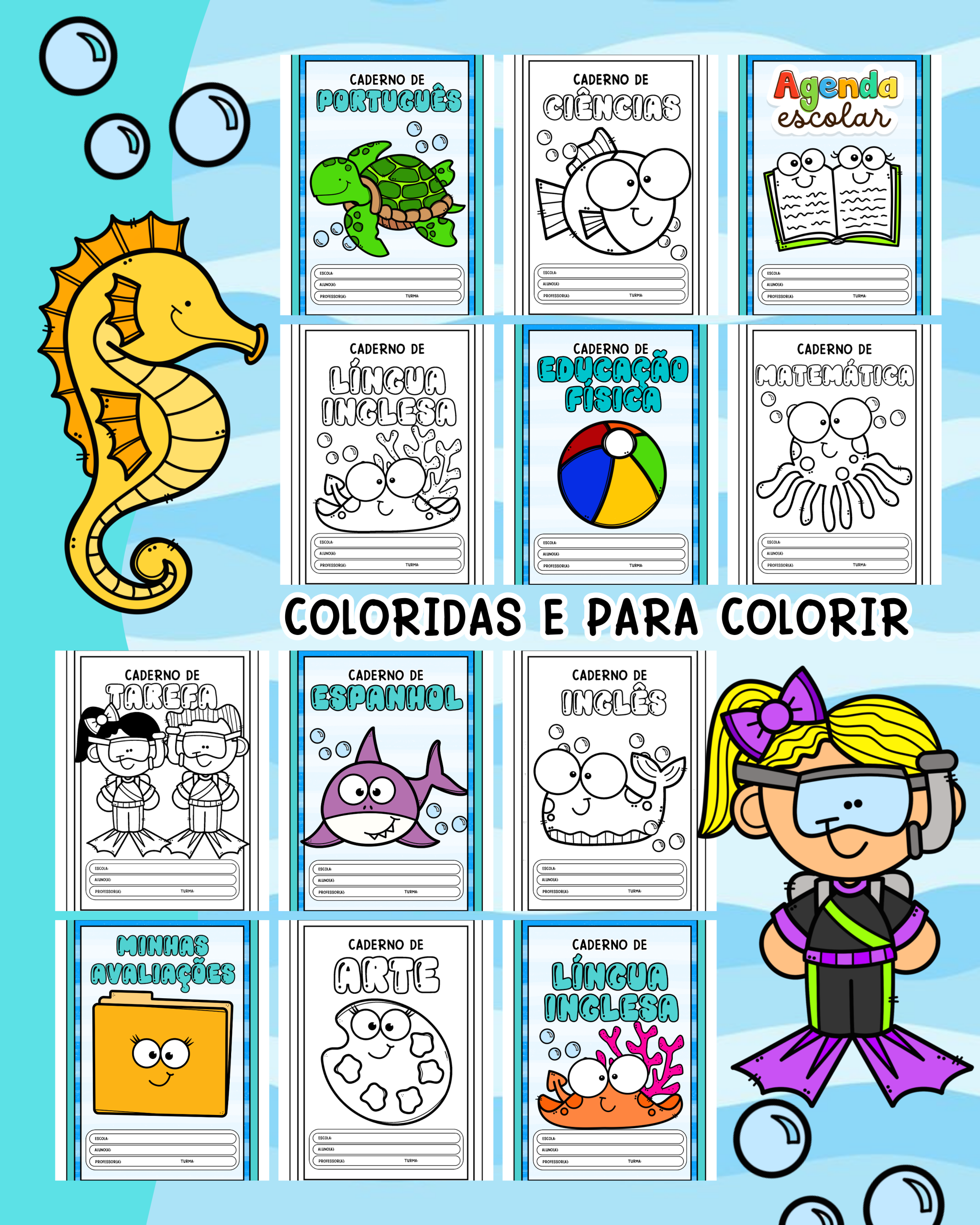 Capinhas de Caderno – Tema Fundo Mar (Coloridas e para Colorir)