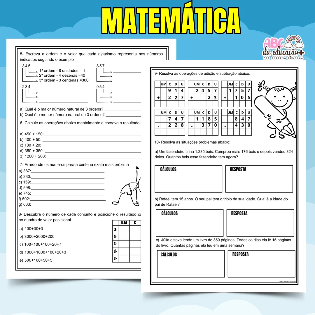 - Matemática 4 páginas: Sistema de numeração decimal, arredondamento; composição e decomposição; cálculo mental; números até a 4ª ordem; adição, subtração e multiplicação; situações problemas; sequência numérica.