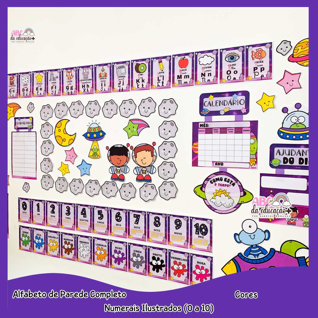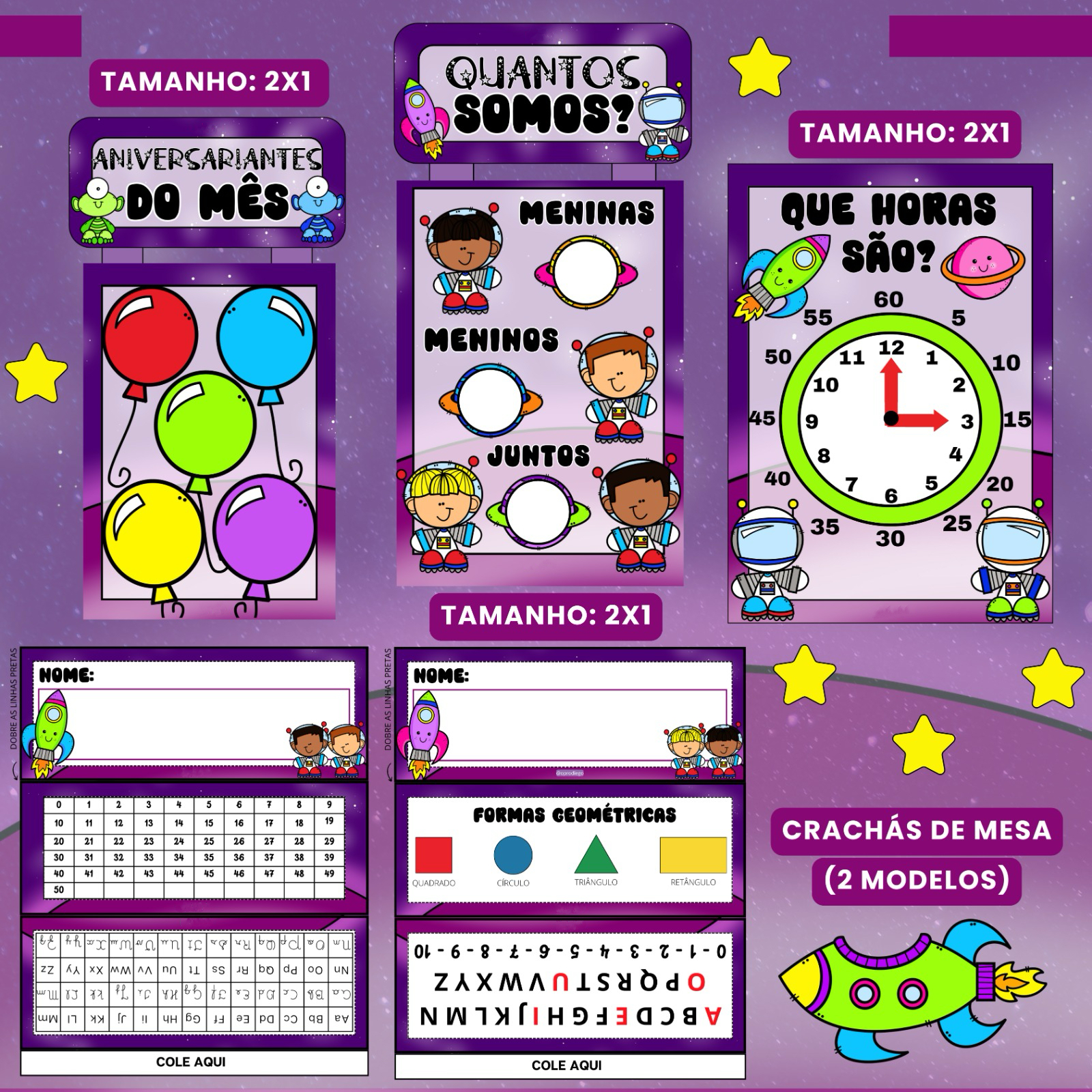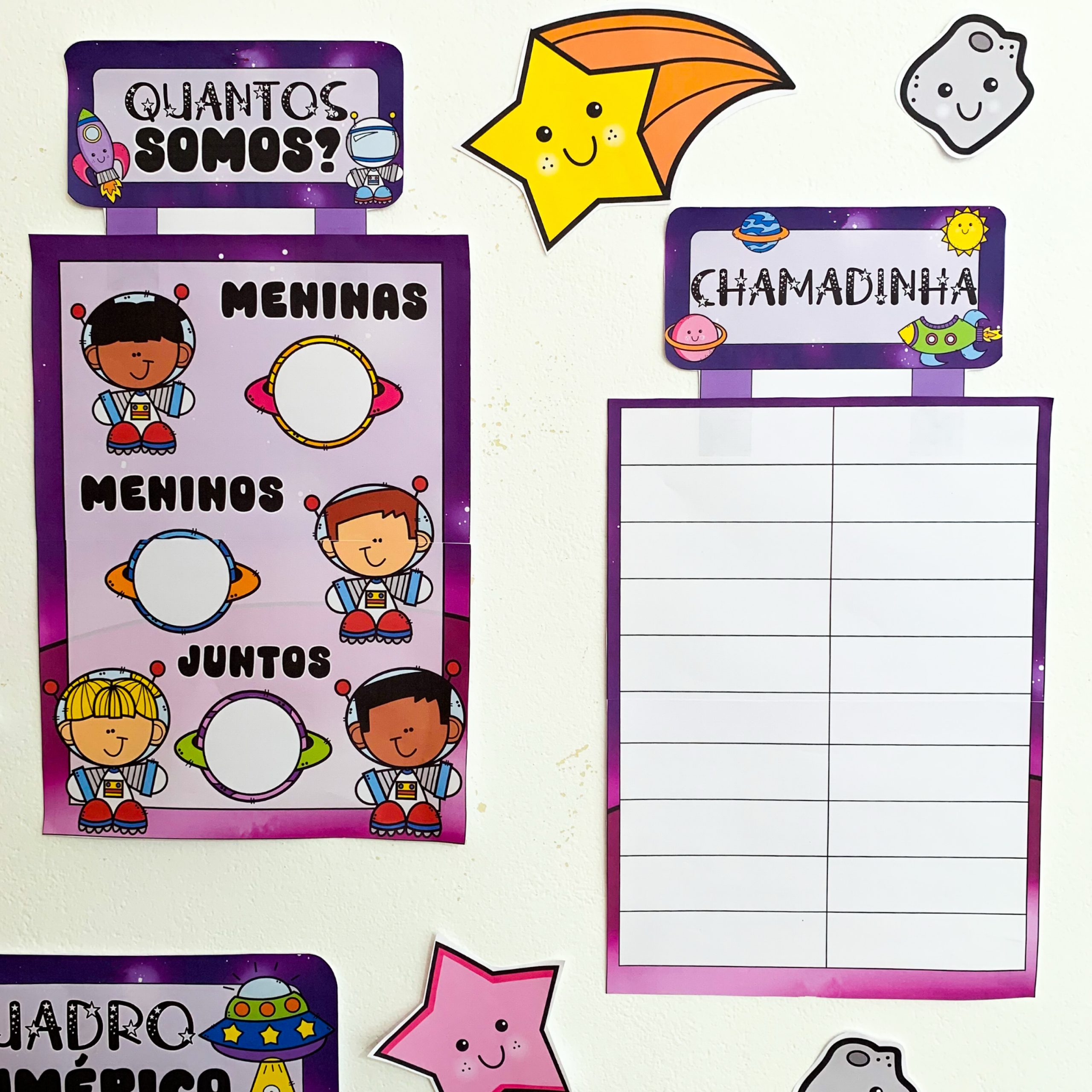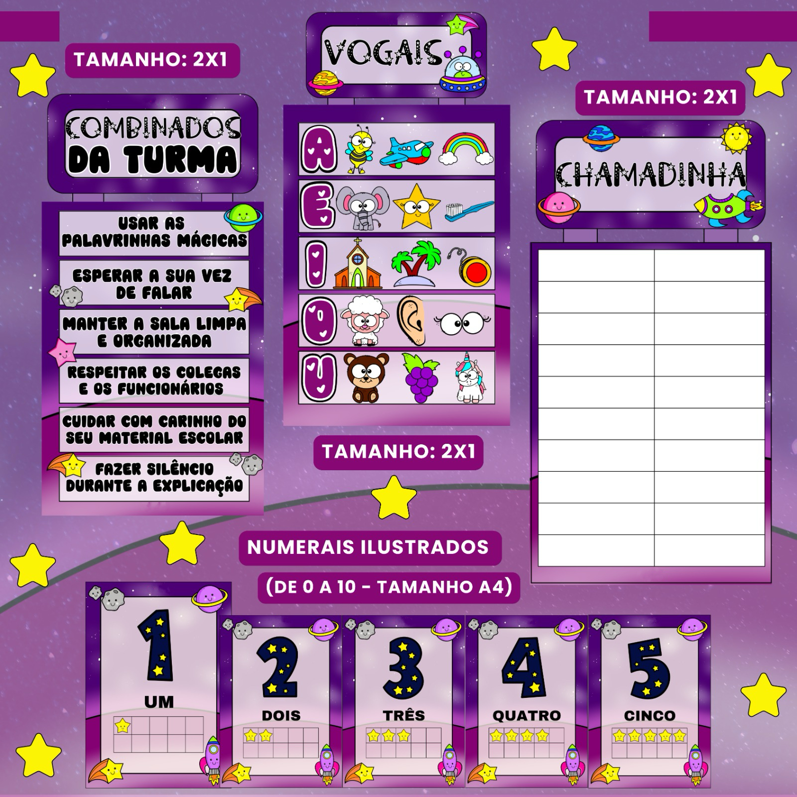 Com ilustrações coloridas e temática espacial, o kit auxilia na organização da rotina diária, no acompanhamento dos alunos e no desenvolvimento das habilidades pedagógicas, tornando a sala mais funcional e visualmente encantadora para a Educação Infantil e os Anos Iniciais do Ensino Fundamental.