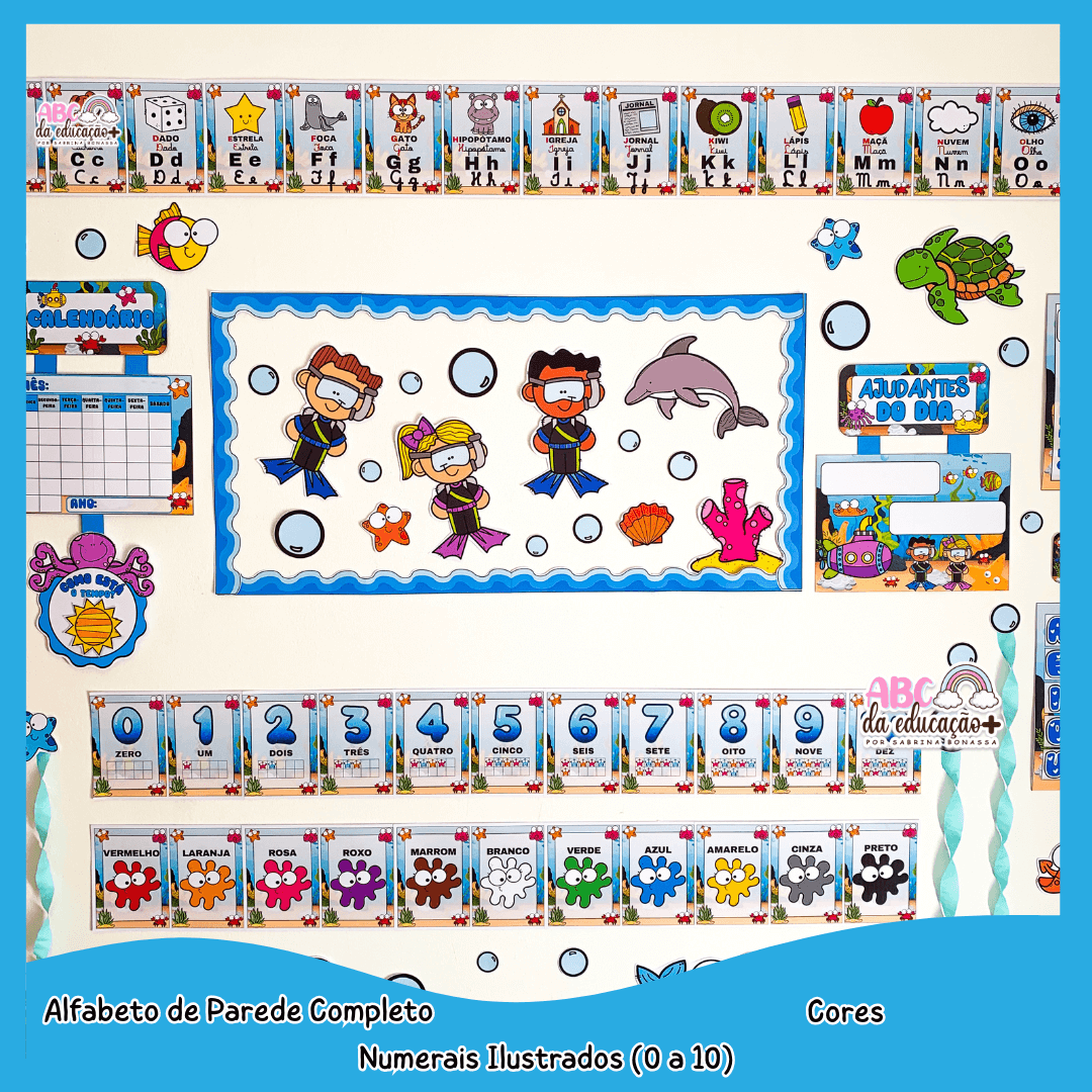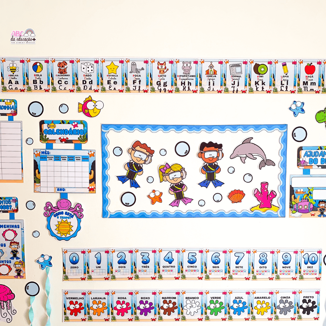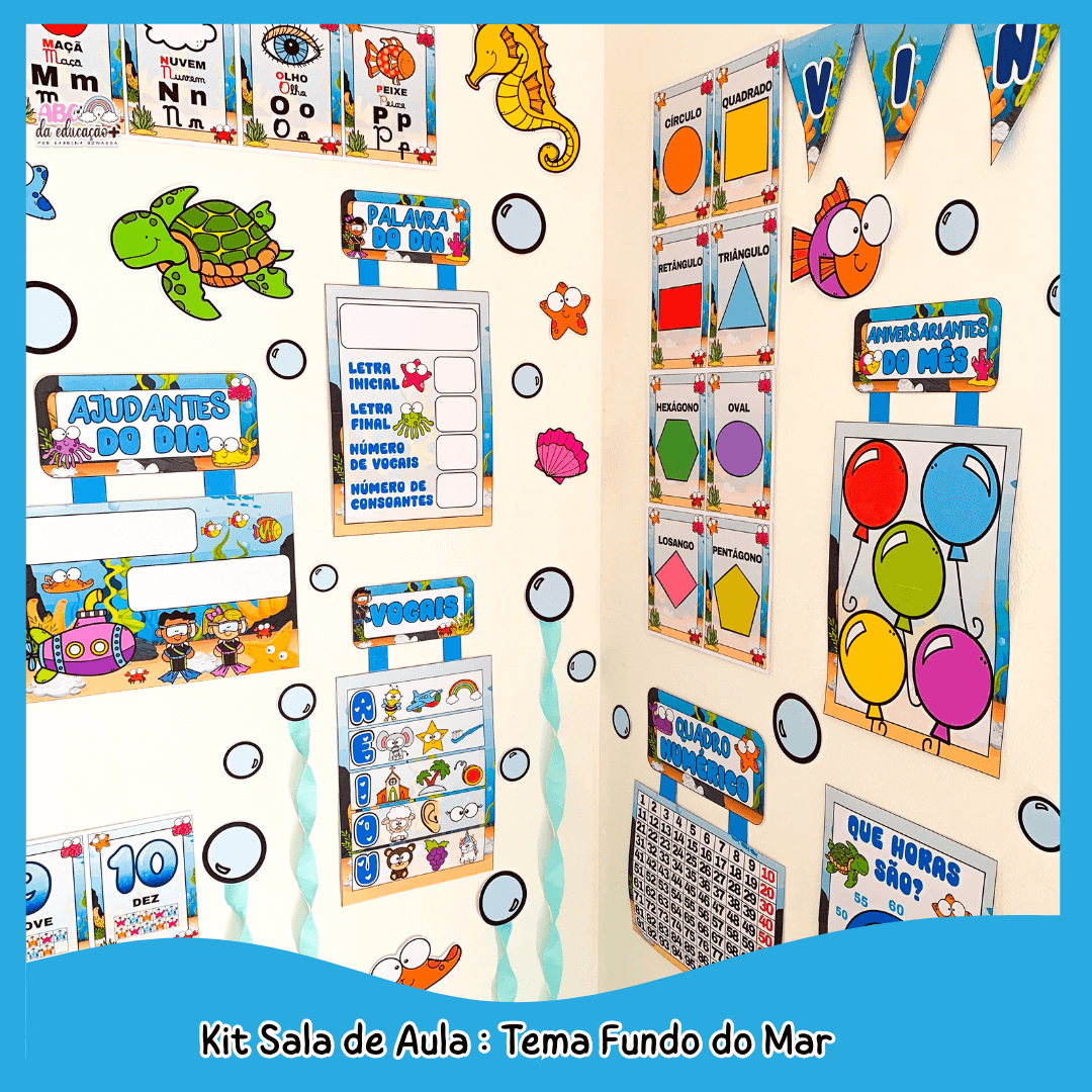 Deixe sua sala de aula ainda mais encantadora, organizada e pedagógica com o Kit Completo de Ornamentação de Sala – Tema Fundo do Mar.