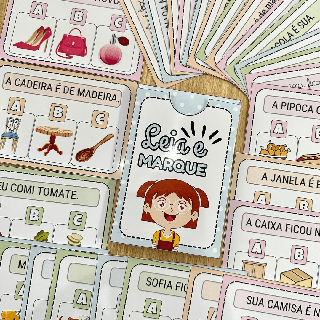O arquivo Leia e Marque inclui 20 frases diferentes para a criança realizar a leitura, identificar e marcar qual imagem corresponde a frase.
