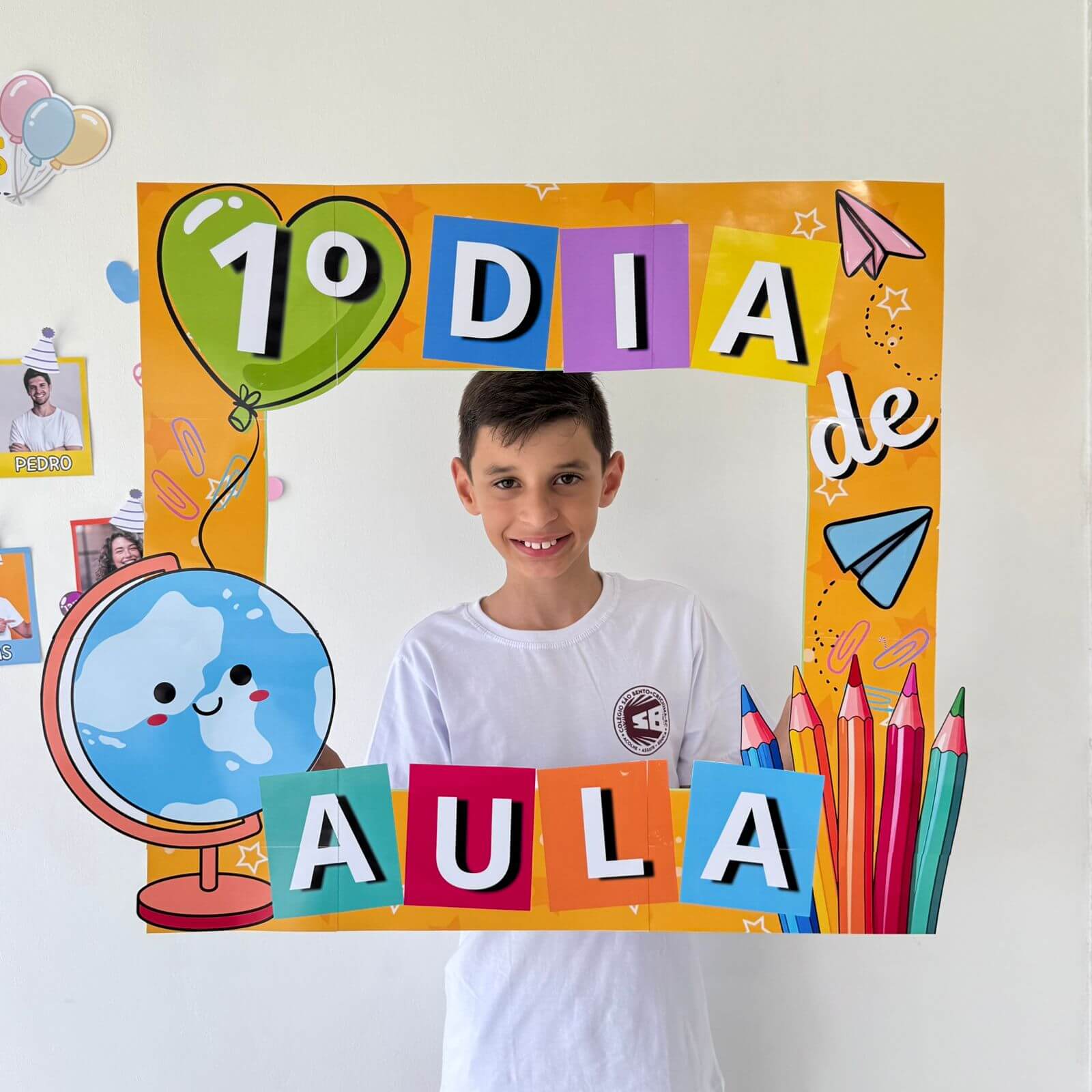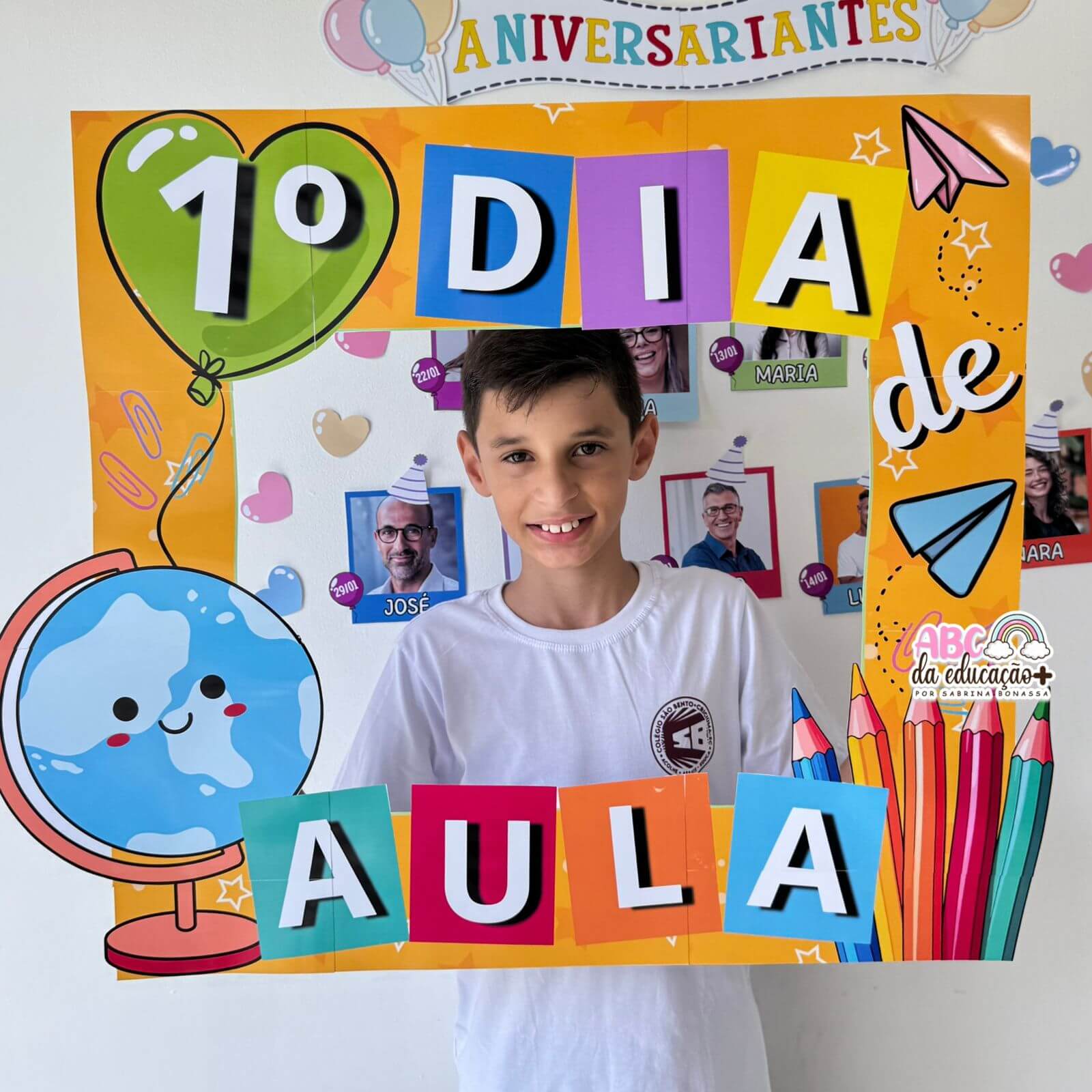 Com ilustrações coloridas e linguagem visual infantil, ela transforma o momento da foto em uma experiência divertida e memorável para os alunos.