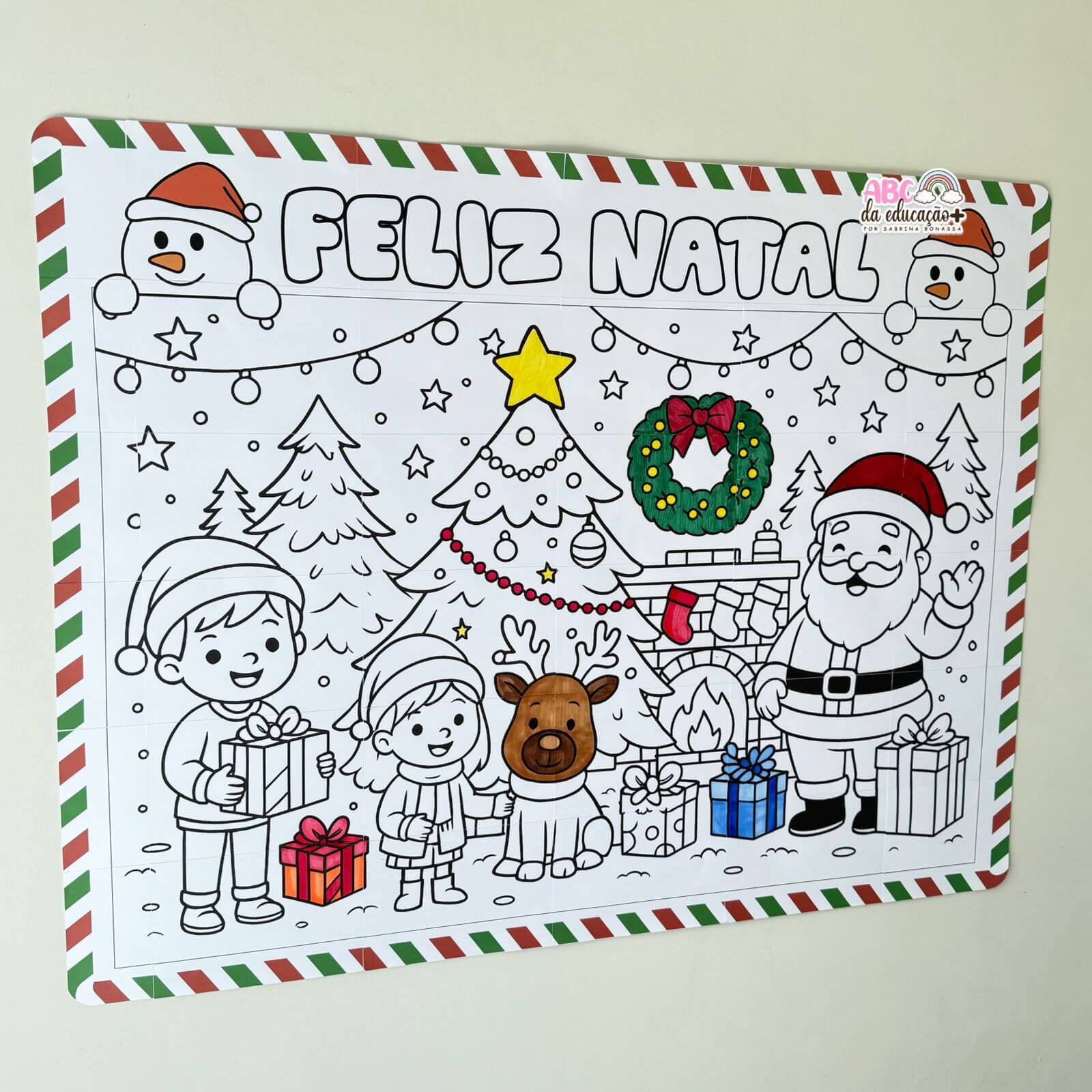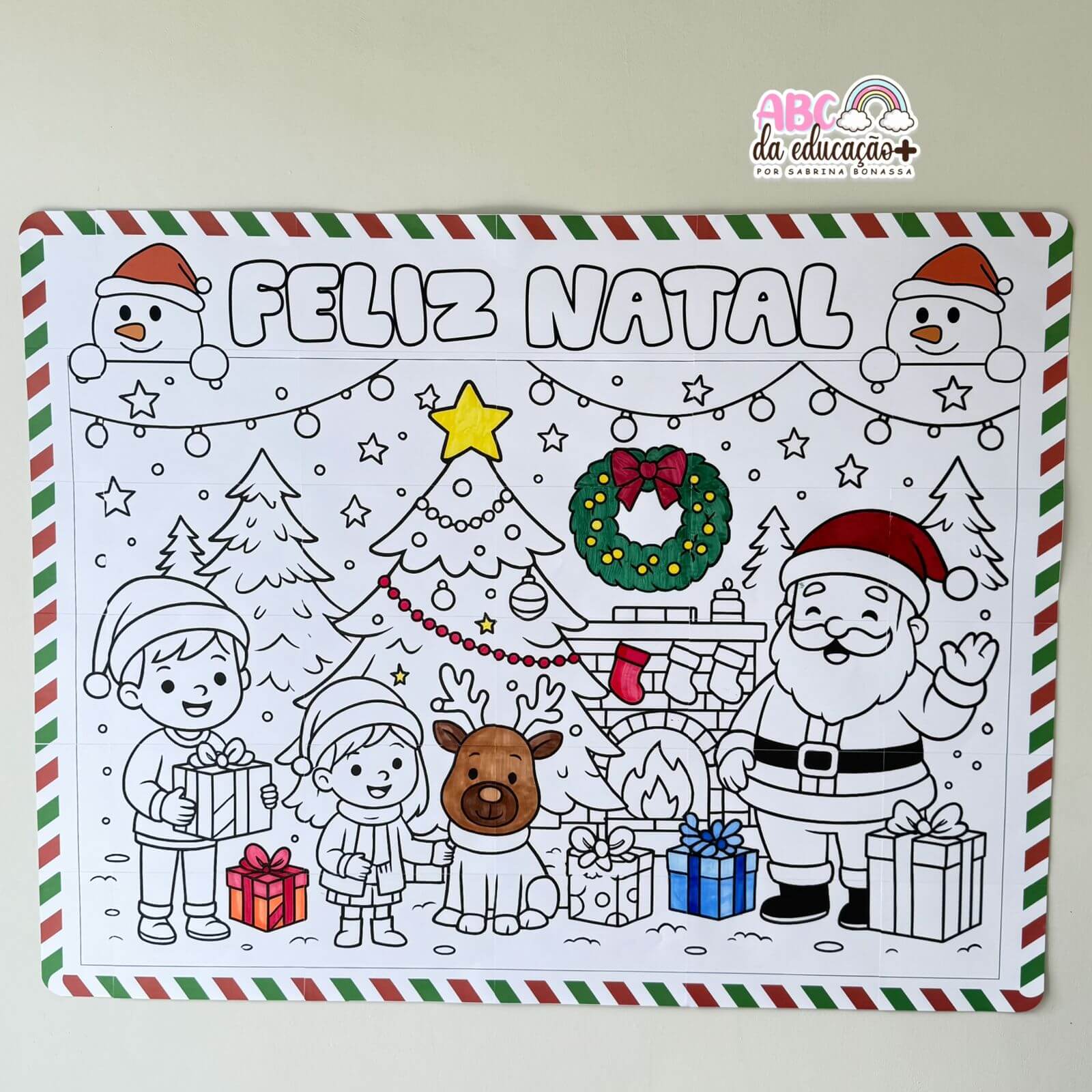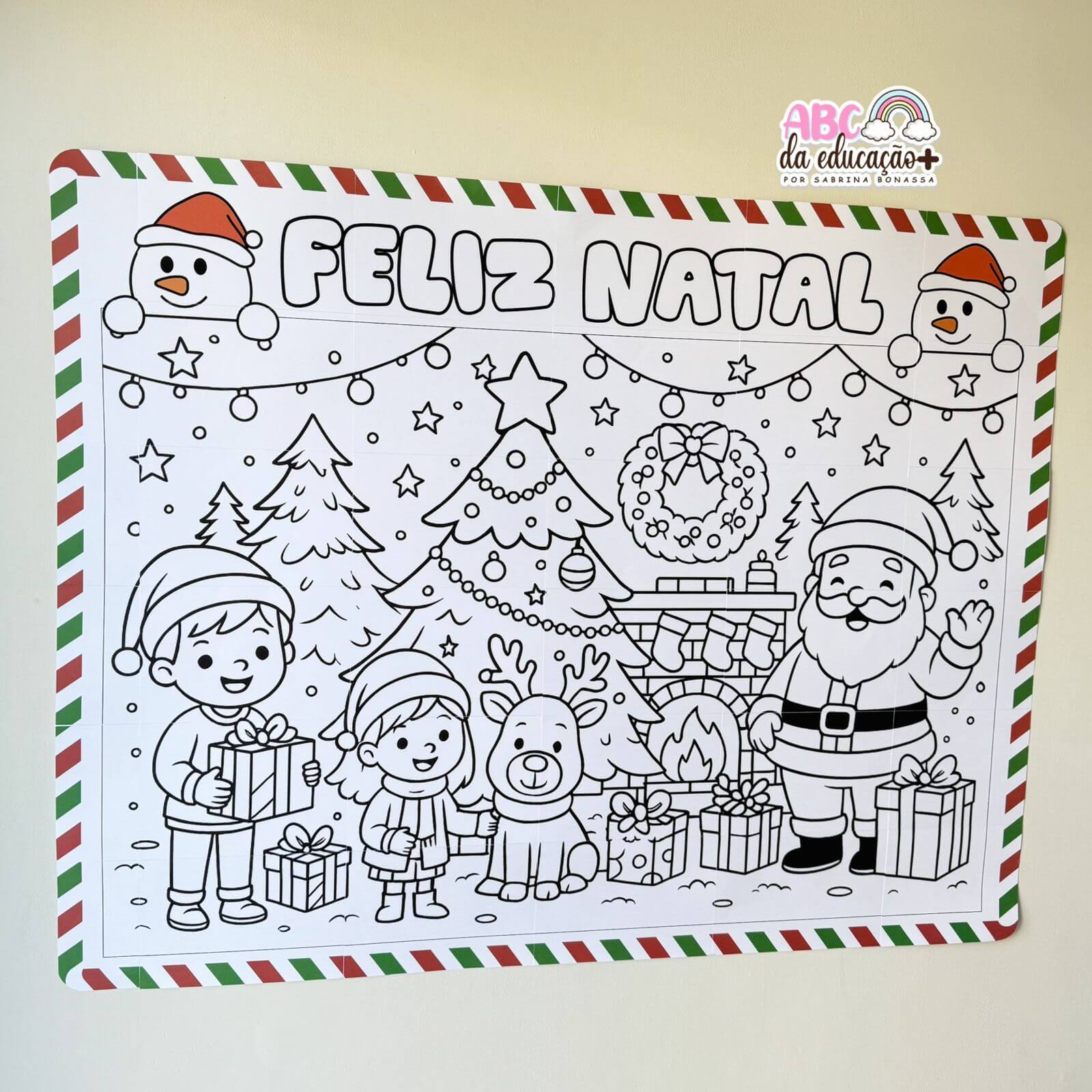 - O painel final montado mede 145 × 115 cm e vem dividido em 33 páginas para impressão. A borda natalina e os bonequinhos de neve já vão coloridos. Acompanha também versão em folha A4.