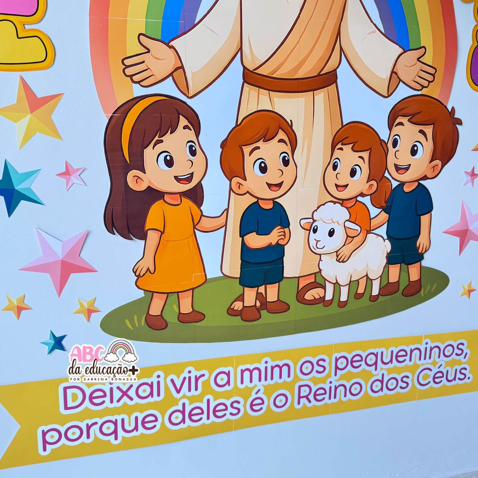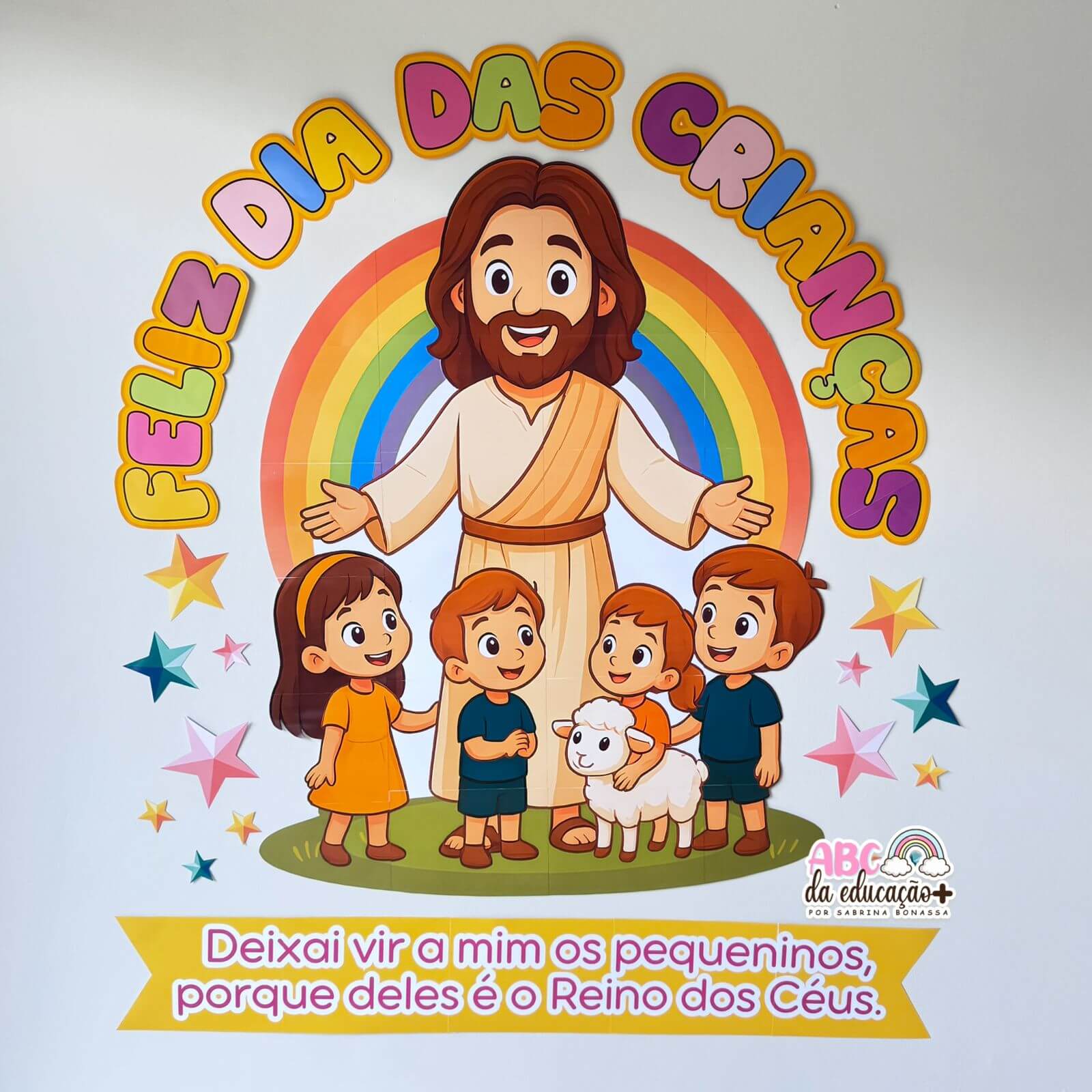 Com ilustração de Jesus rodeado de crianças, arco-íris vibrante e a passagem bíblica “Deixai vir a mim os pequeninos, porque deles é o Reino dos Céus”, esse material é perfeito para decorar salas de aula, igrejas, eventos e celebrações especiais.
